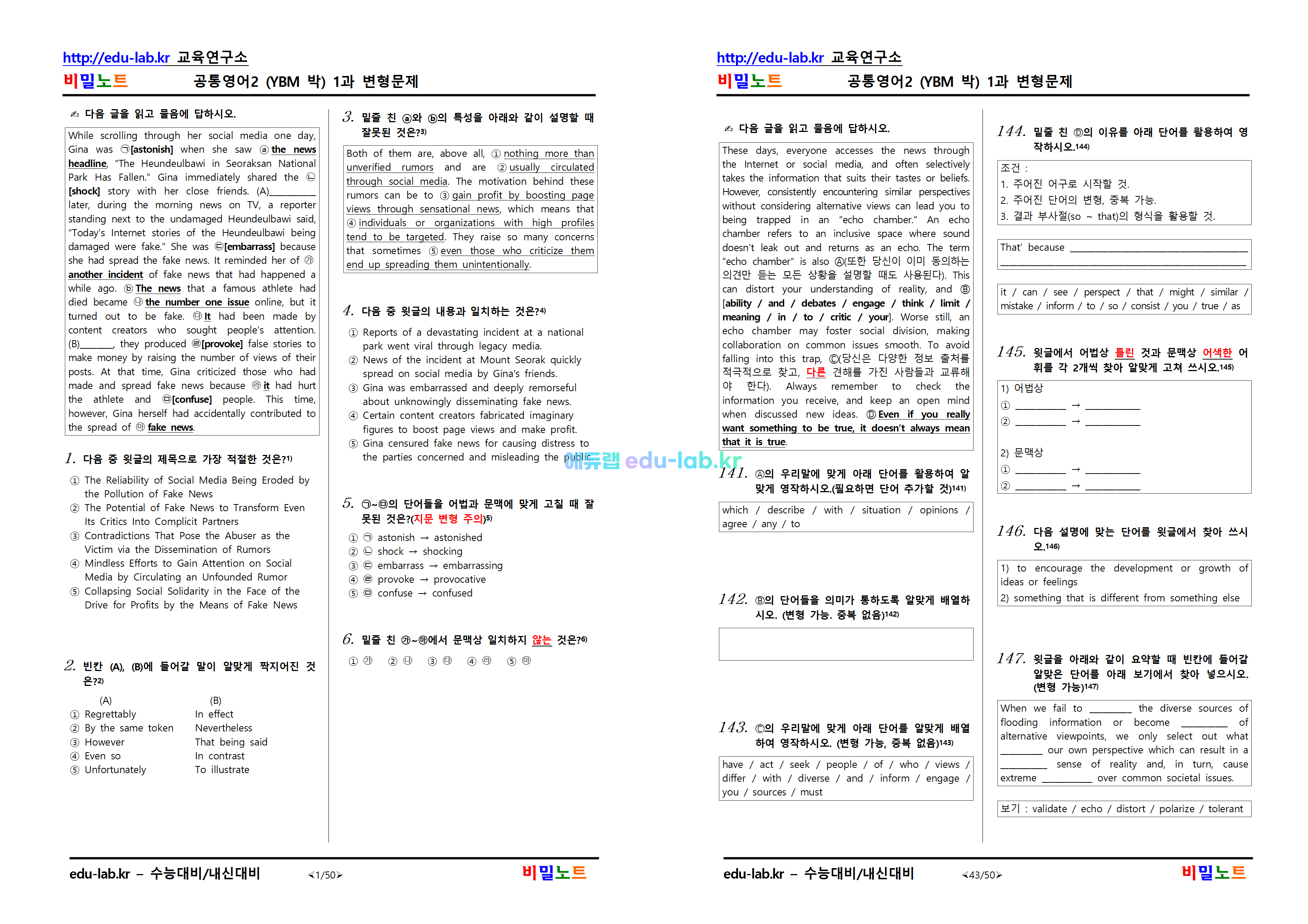 [비밀노트_에듀랩(edu-lab.kr)] 공통영어2_ybm(박) 1과 유형별적중변형문제(프리패스=정회원 전용자료)