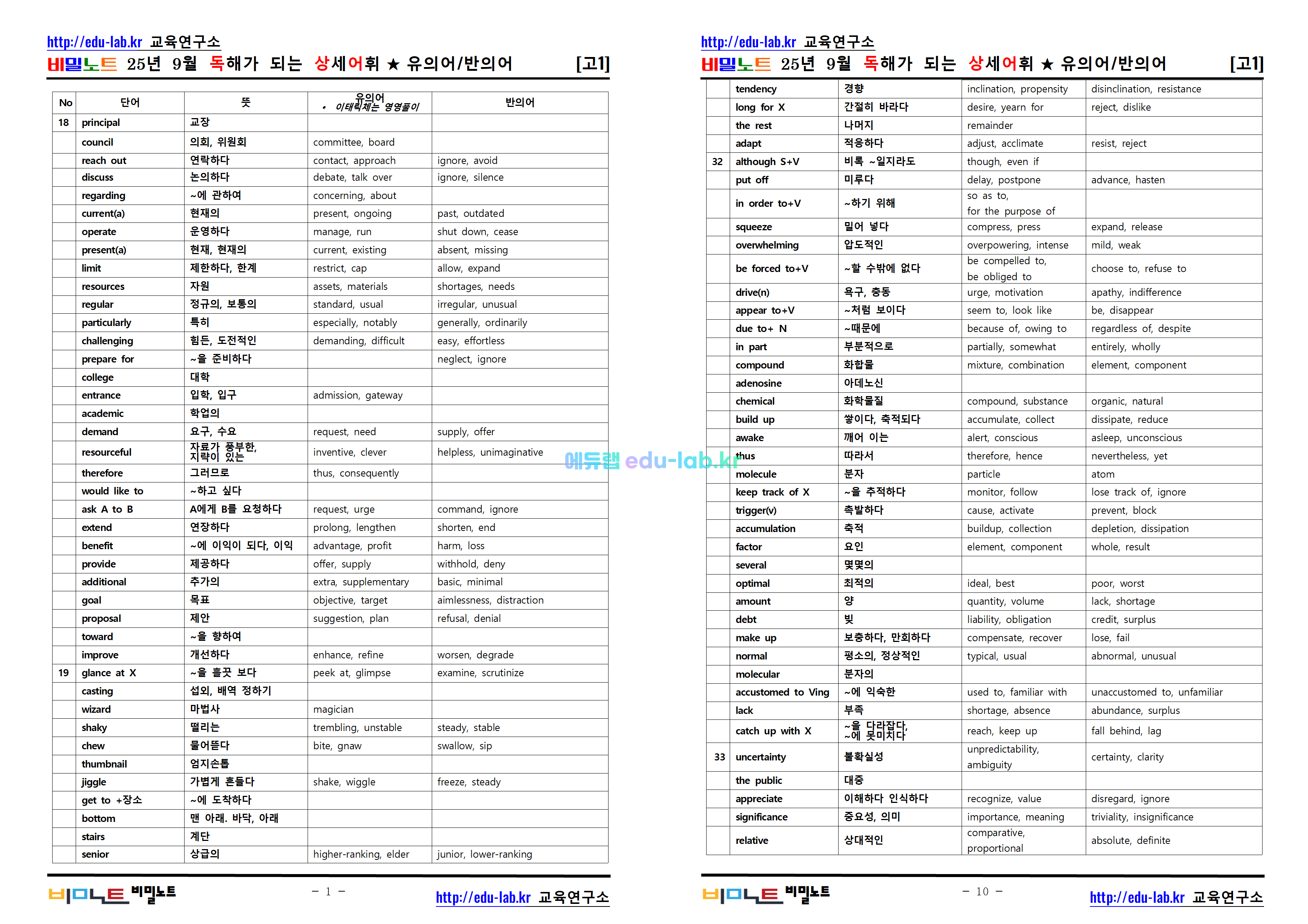 [비밀노트_에듀랩(edu-lab.kr)] 25년 9월 고1 독해가되는 상세어휘_유의어_반의어_TEST포함(프리패스=전용자료)