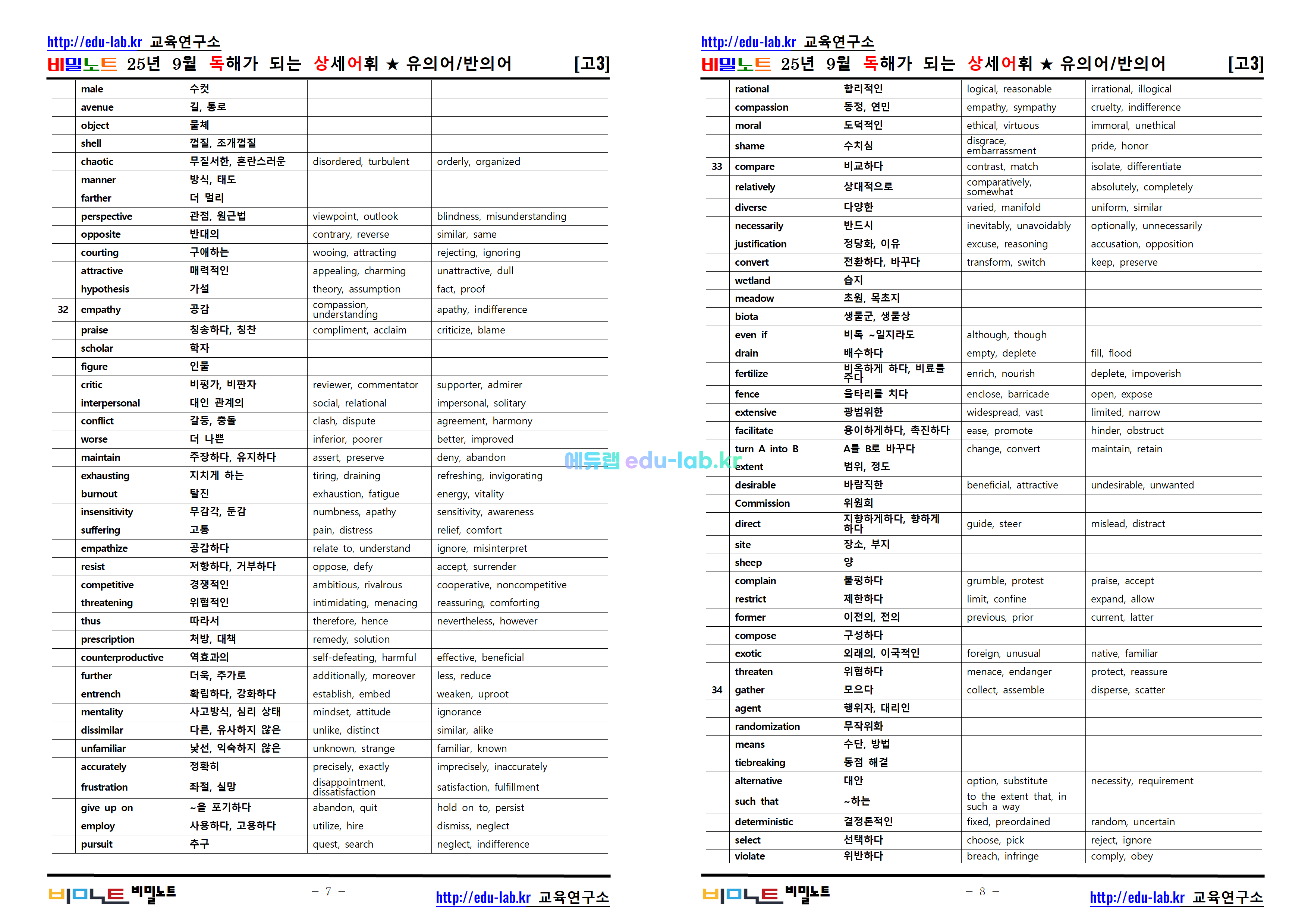[비밀노트_에듀랩(edu-lab.kr)] 25년 9월 고3 독해가되는 상세어휘_유의어_반의어_TEST포함(프리패스=정회원 전용자료)