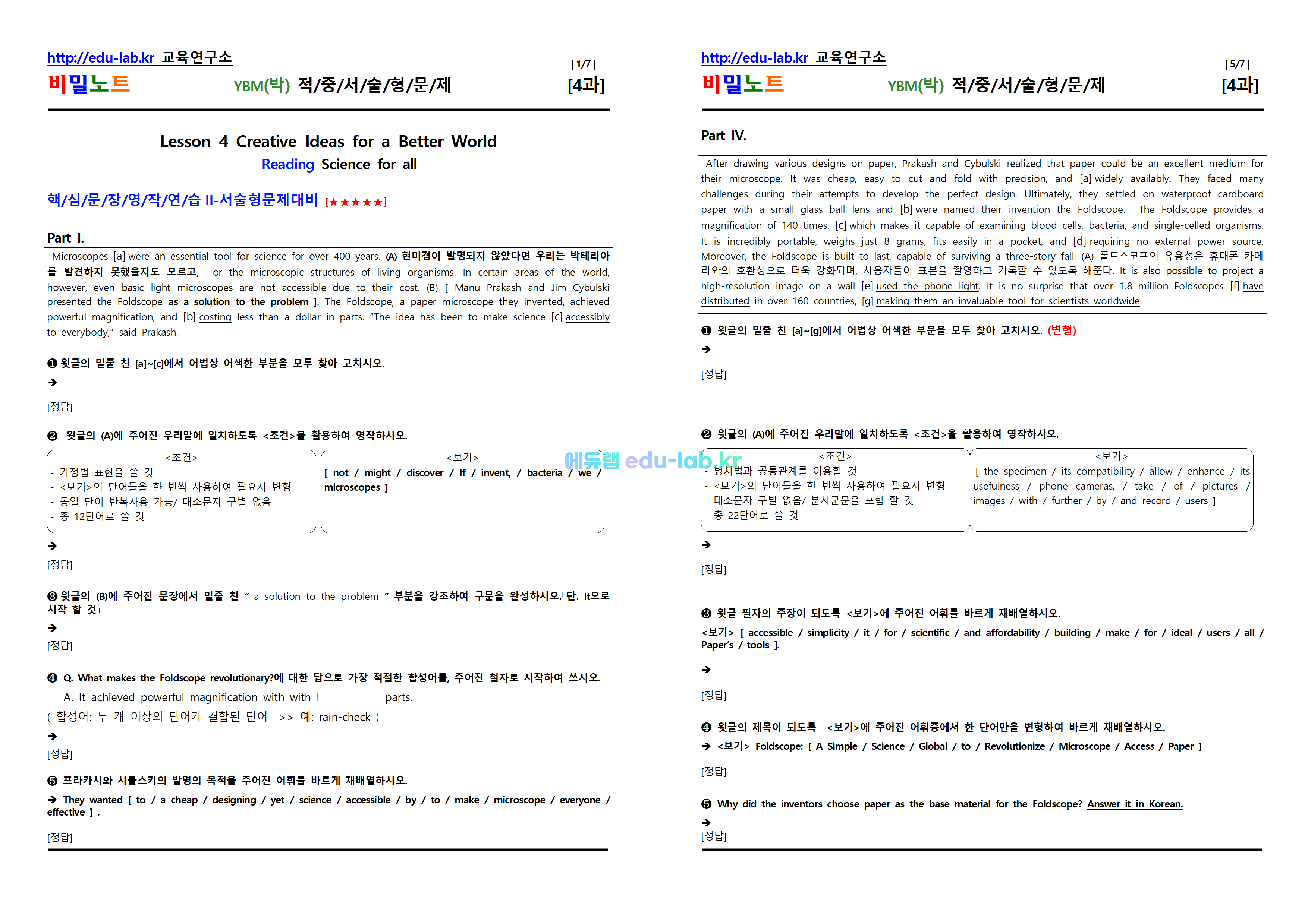 [비밀노트_에듀랩(edu-lab.kr)] 공통영어2 YBM(박)_4과_서술형문제(프르패스=정회원 전용자료)[비밀노트_에듀랩(edu-lab.kr)] 공통영어2 YBM(박)_4과_서술형문제