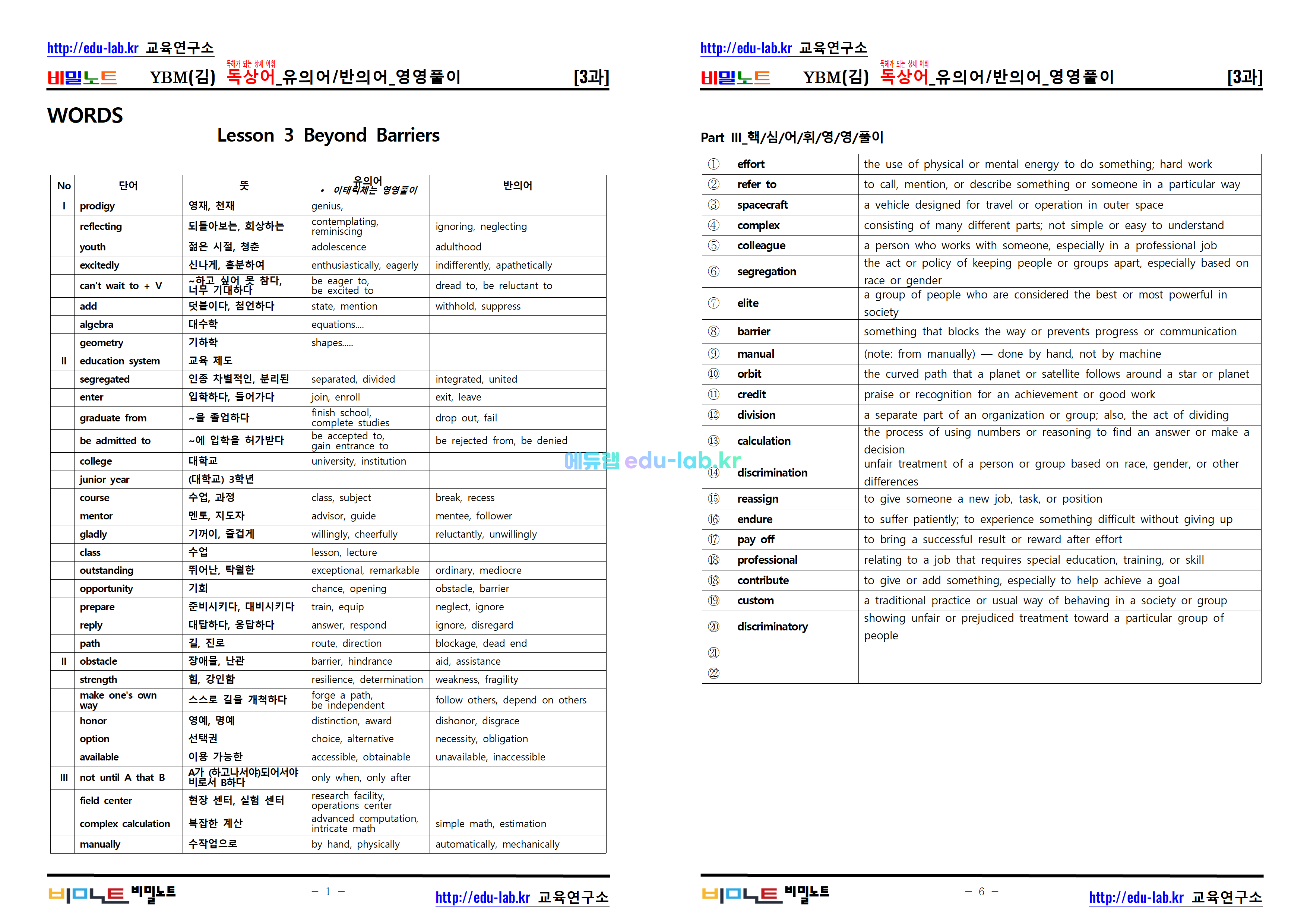 [비밀노트_에듀랩(edu-lab.kr)] 공통영어2 YBM(김) 3과 독상어_유의어 반의어_영영풀이_테스트포함(프리패스=정회원전용자료)