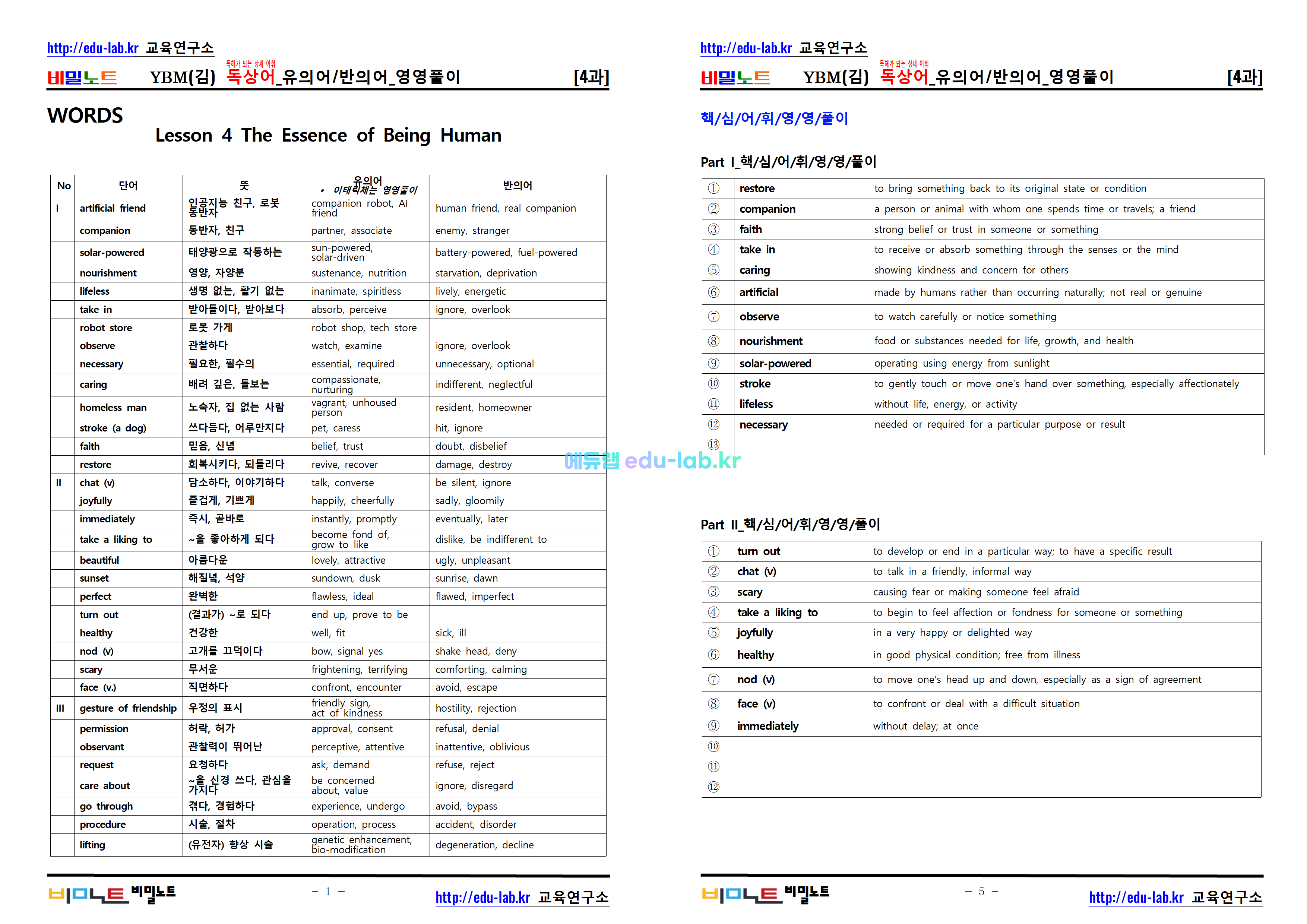 [비밀노트_에듀랩(edu-lab.kr)] 공통영어2 YBM(김) 4과 독상어_유의어 반의어_영영풀이_테스트포함(프리패스=정회원전용자료)