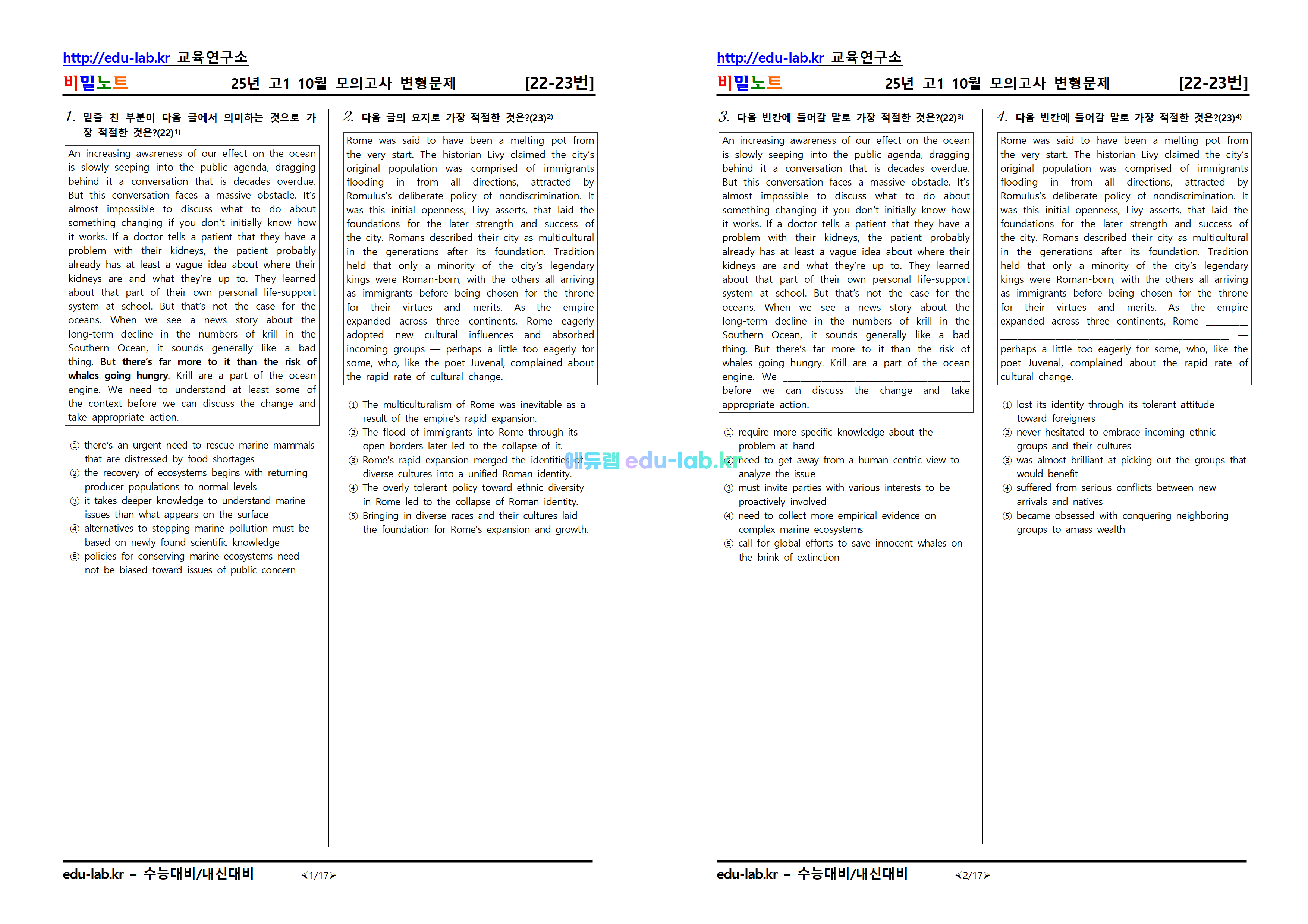 [비밀노트_에듀랩(edu-lab.kr)] 25년 10월 고1 모의고사 유형별적중변형문제는 29일에 업로드 예정입니다.