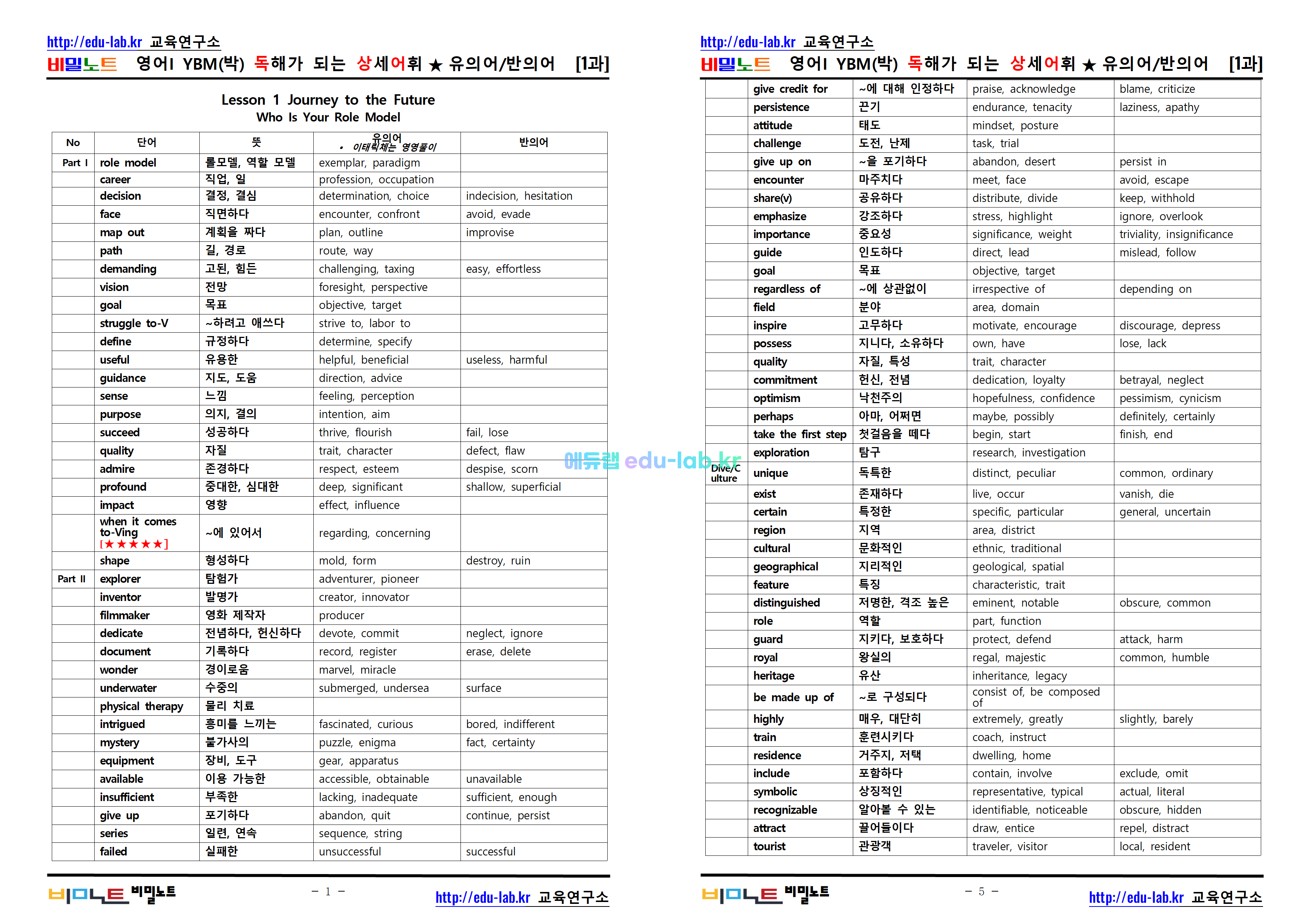 [비밀노트_에듀랩(edu-lab.kr)] 22개정 능률(오) 영어1 2과 독해가되는 상세어휘_유의어_반의어_TEST포함(프리패스전용)
