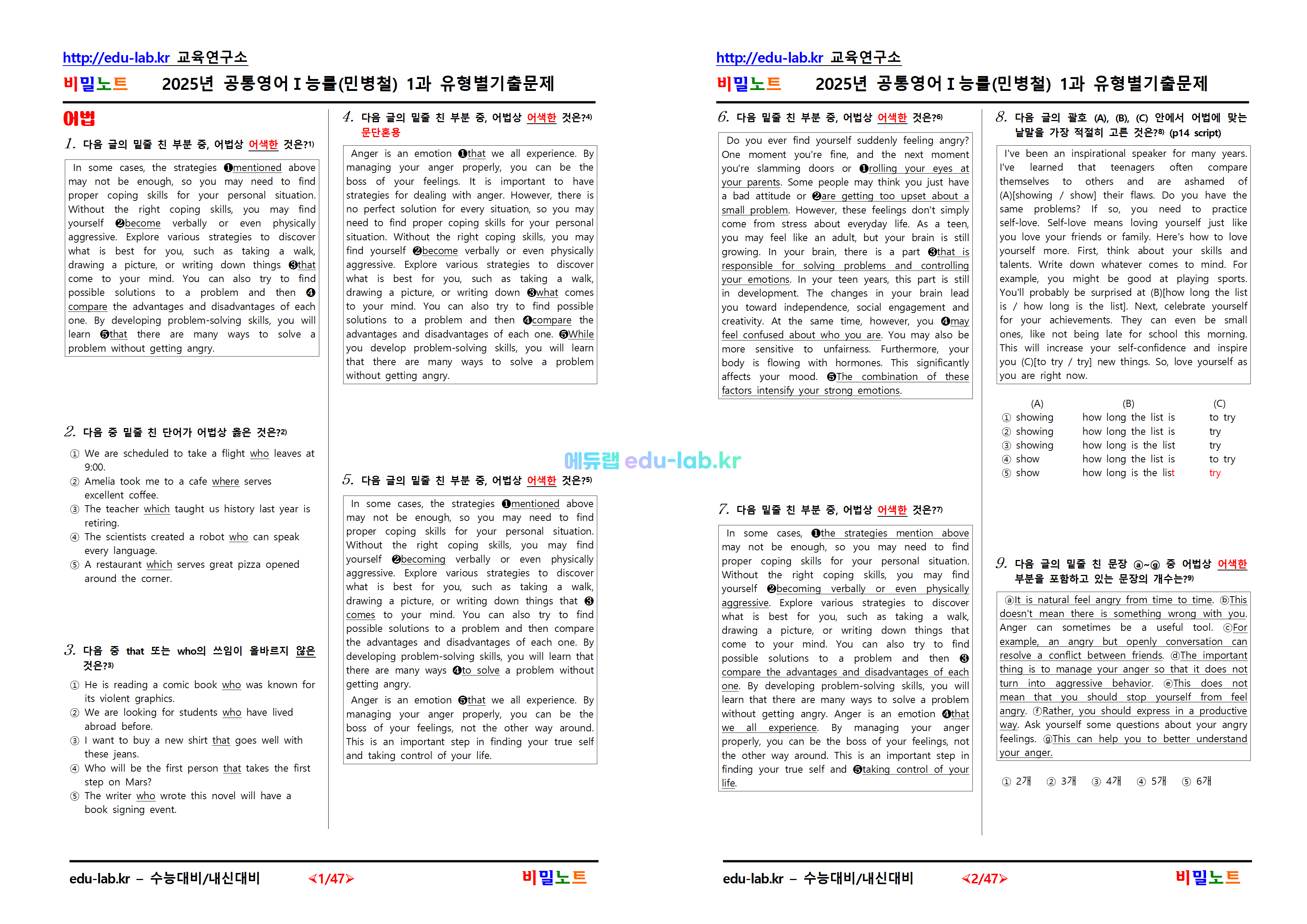 [적중기출문제] 2025년_공통영어1_능률(김)_1과_유형별기출문제_149문제(프리패스전용)[비밀노트_에듀랩(edu-lab.kr)] 2025년_공통영어1_능률(김)_1과_유형별기출문제_149문제(프리패스전용)