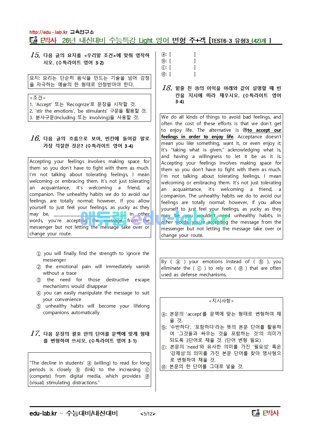 26년 내신대비 수능특강 Light 영어 변형 주+객 [TEST6-3 (42)개 ]안녕하세요!!. E 박사입니다.
