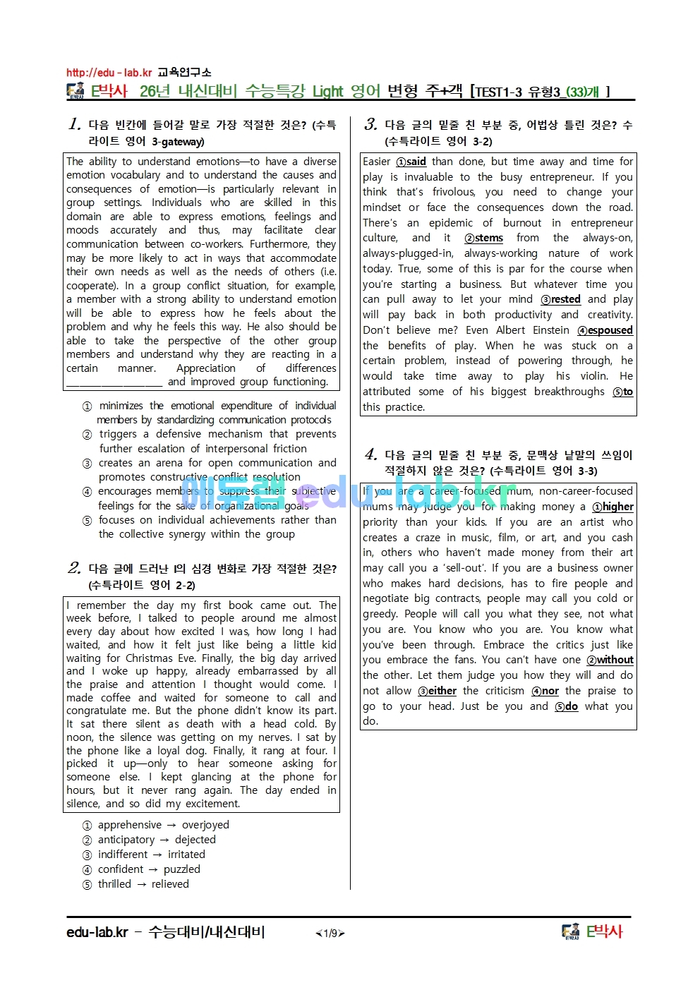 26년 내신대비 수능특강 Light 영어 변형 주+객 [TEST1-3 유형3_(33)개 ]
