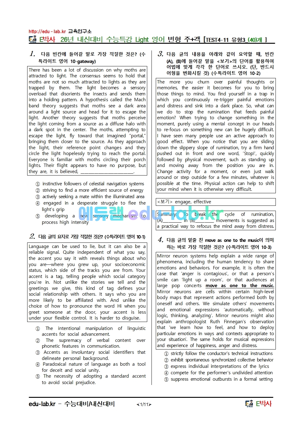 26년 내신대비 수능특강 Light 영어 변형 주+객 [TEST4-11 유형3_(40)개 ]안녕하세요!! E박사입니다.
