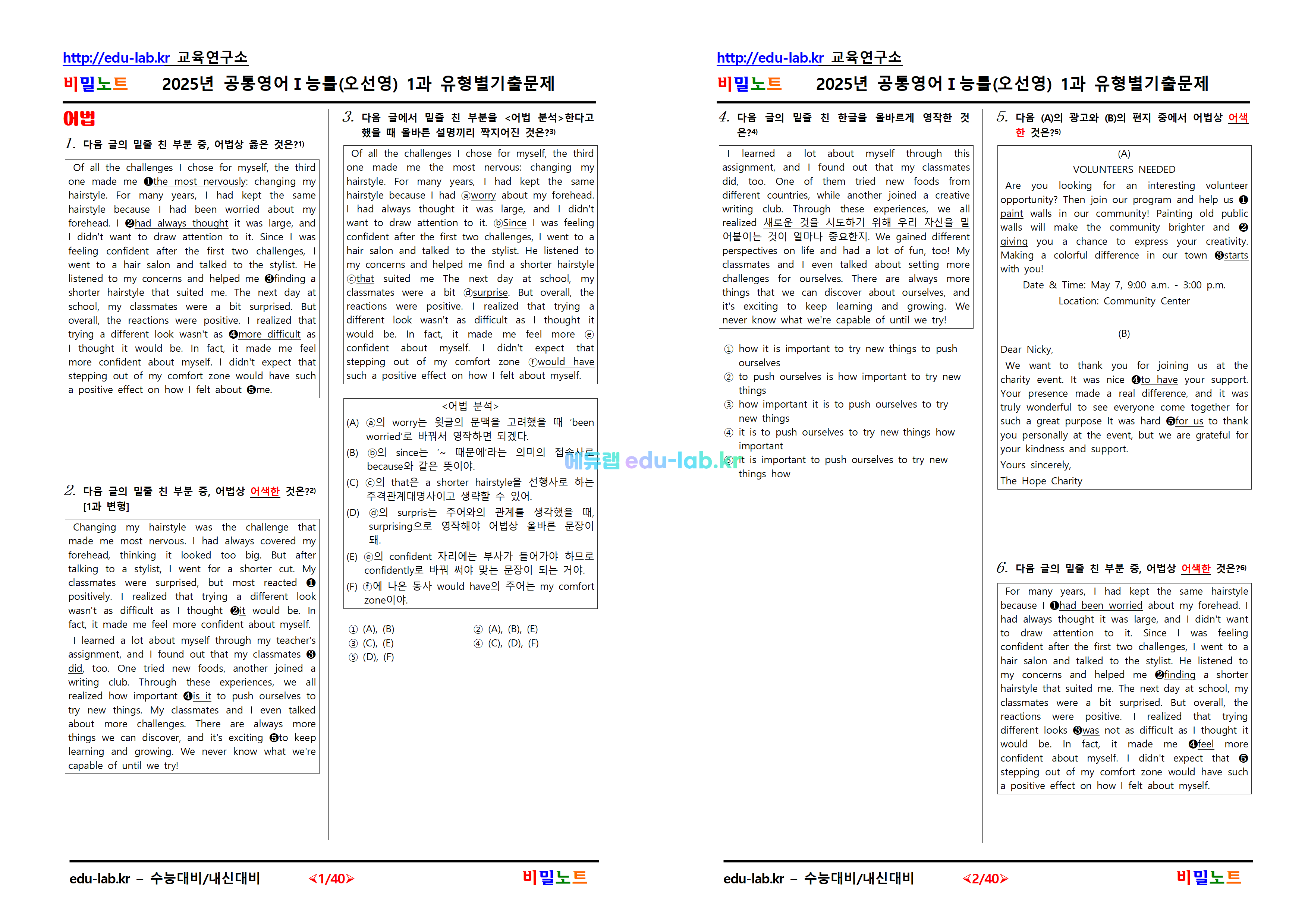 [비밀노트_에듀랩(edu-lab.kr)] 2025년_공통영어1_능률(오선영)_1과_유형별기출문제_116문제(프리패스=정회원 전용자료)