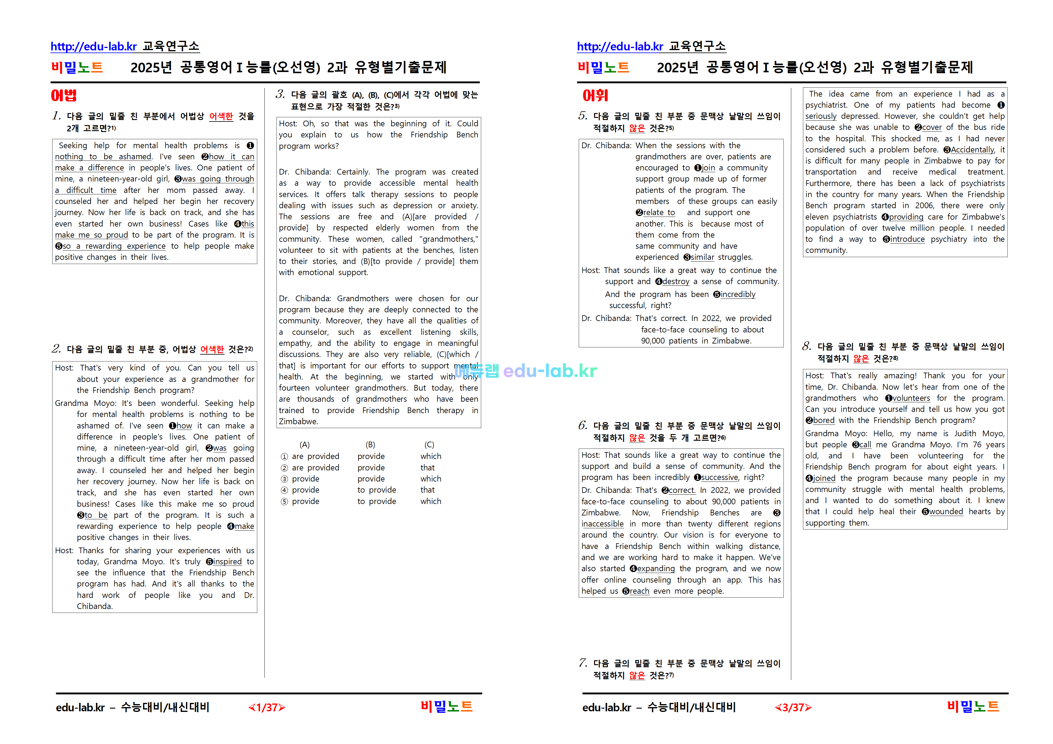 [비밀노트_에듀랩(edu-lab.kr)] 2025년_공통영어1_능률(오선영)_2과_유형별기출문제_116문제(프리패스=정회원 전용자료)