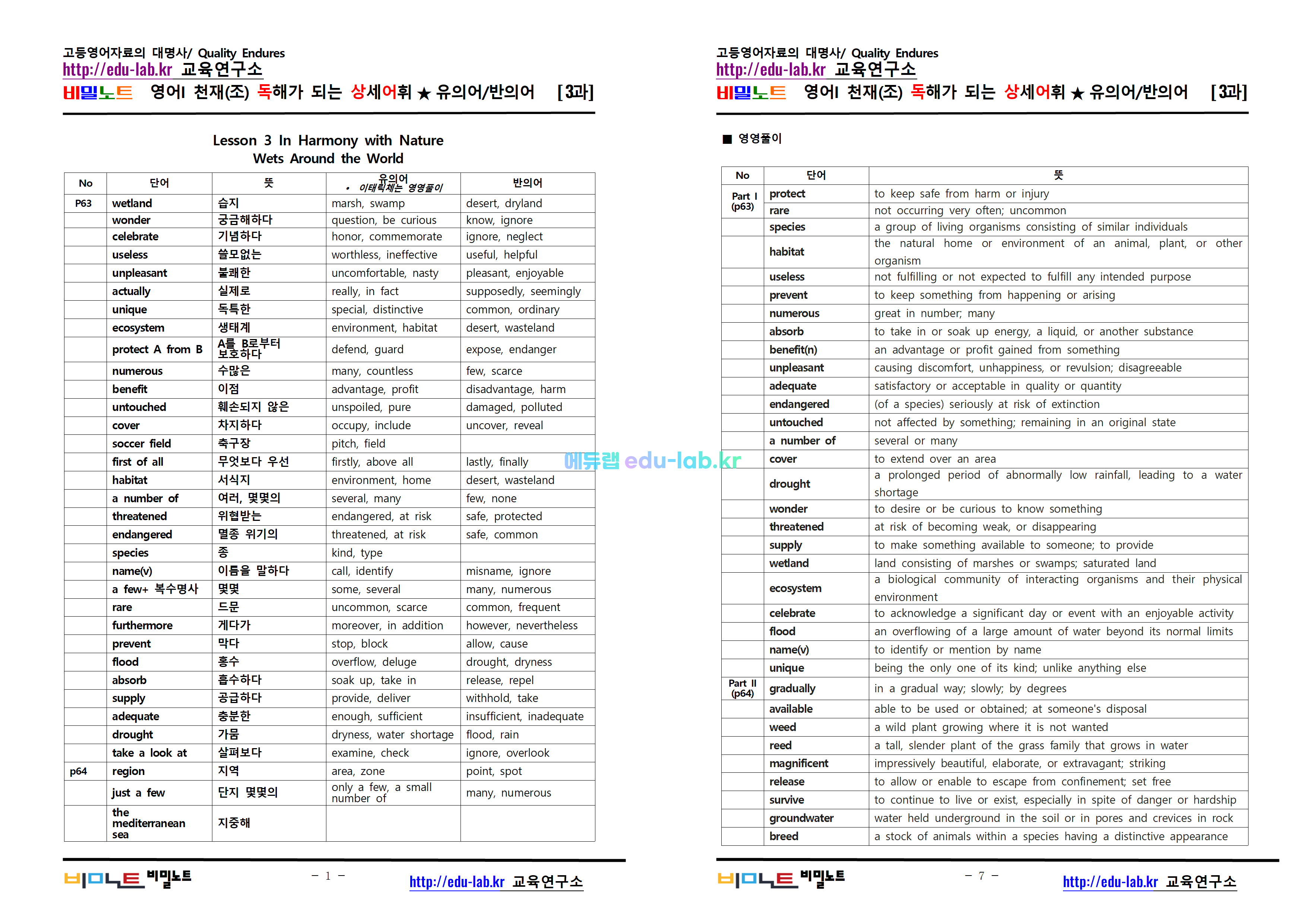 [비밀노트_에듀랩(edu-lab.kr)] 공통영어 천재(조) 3과_ 독해가 되는 상세어휘 및 유의어 반의어_영영풀이(프리패스=정회원전용)