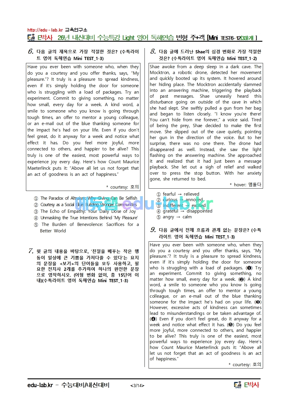 26년 내신대비 수능특강 Light 영어 독해연습 변형 주+객 [Mini TEST6-12(33)개 ]