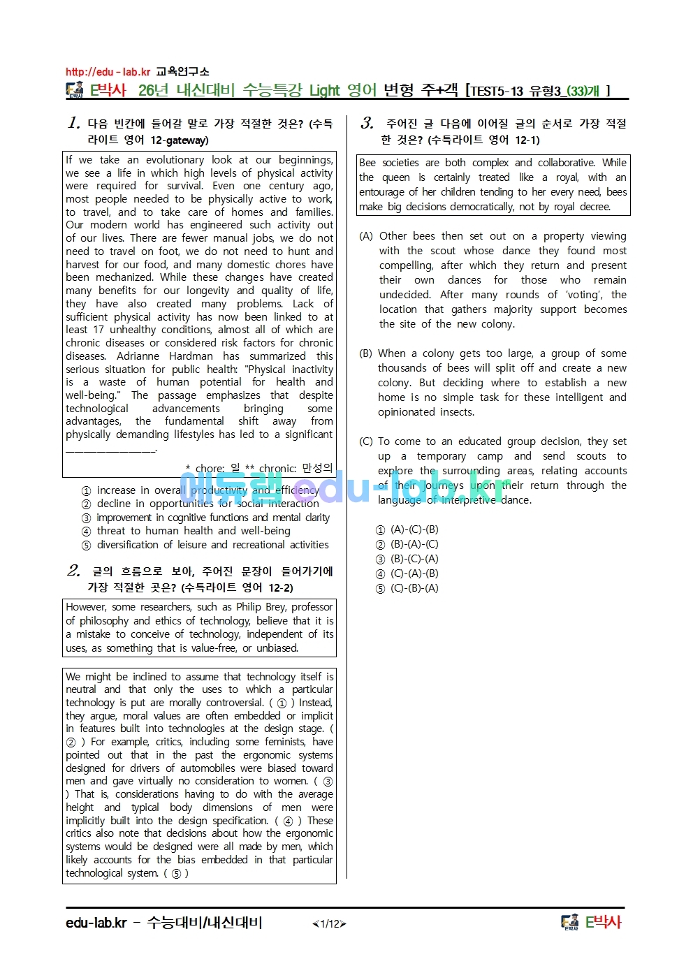 26년 내신대비 수능특강 Light 영어 변형 주+객 [TEST5-13 유형3_(33)개 ]안녕하세요. E박사입니다.!!