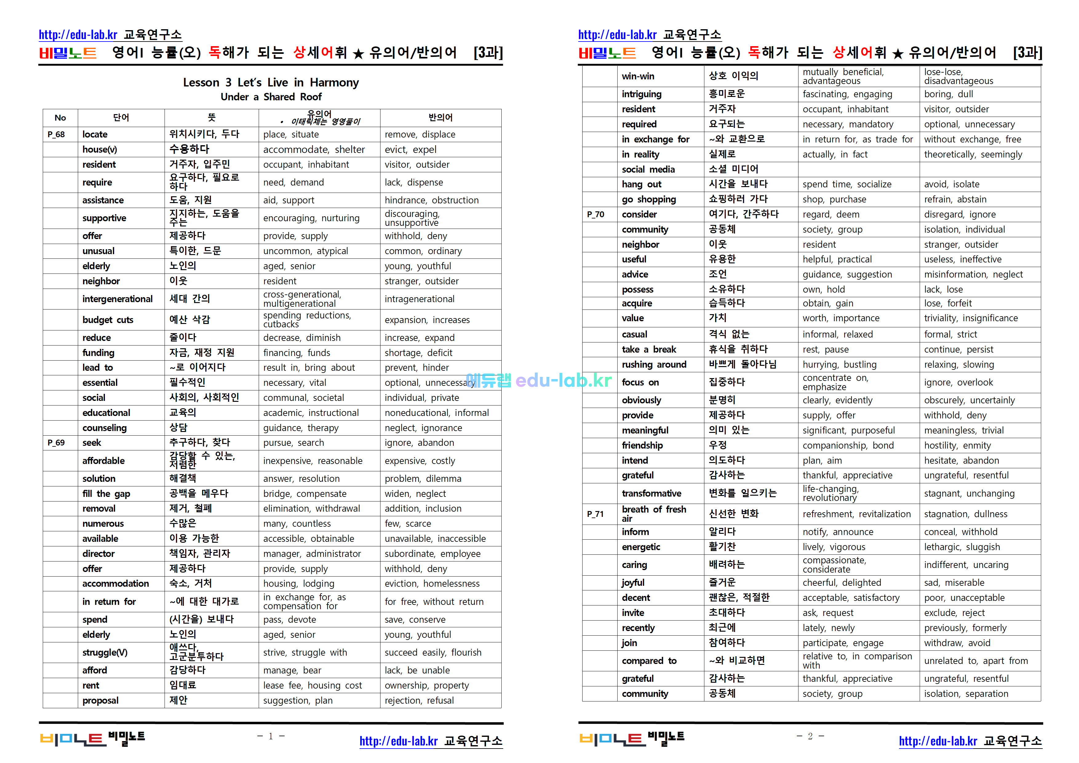 [비밀노트_에듀랩(edu-lab.kr)] 22개정 능률(오) 영어1 3과 독해가되는 상세어휘_유의어_반의어_TEST포함(프리패스전용)