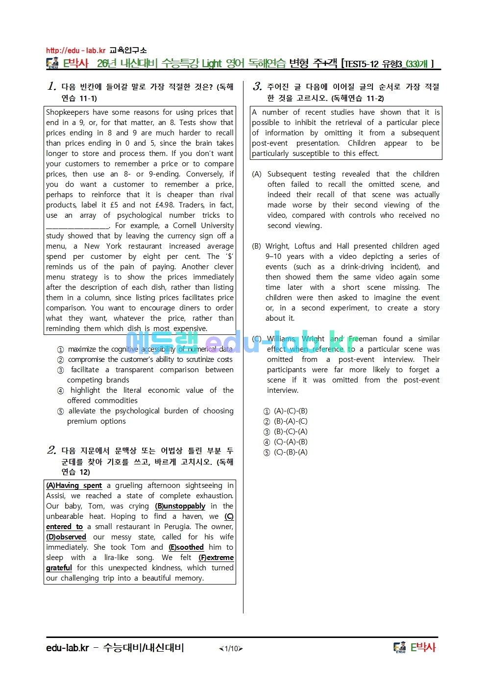 26년 내신대비 수능특강 Light 영어 독해연습 변형 주+객 [TEST5-12 유형3_(33)개안녕하세요. E박사입니다.!!