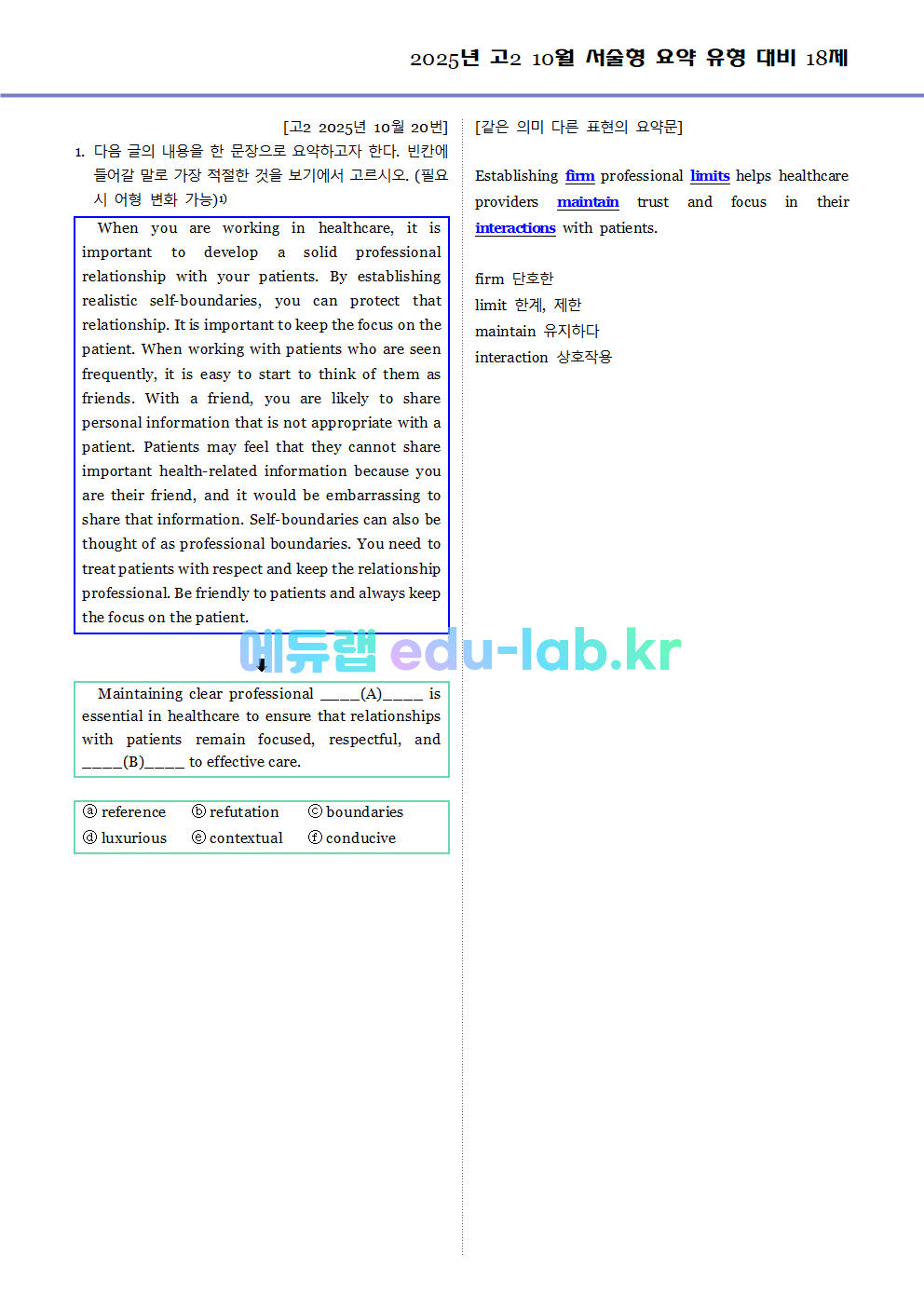 나머지 18개의 지문으로 서술형 요약 문제를 만들었습니다.